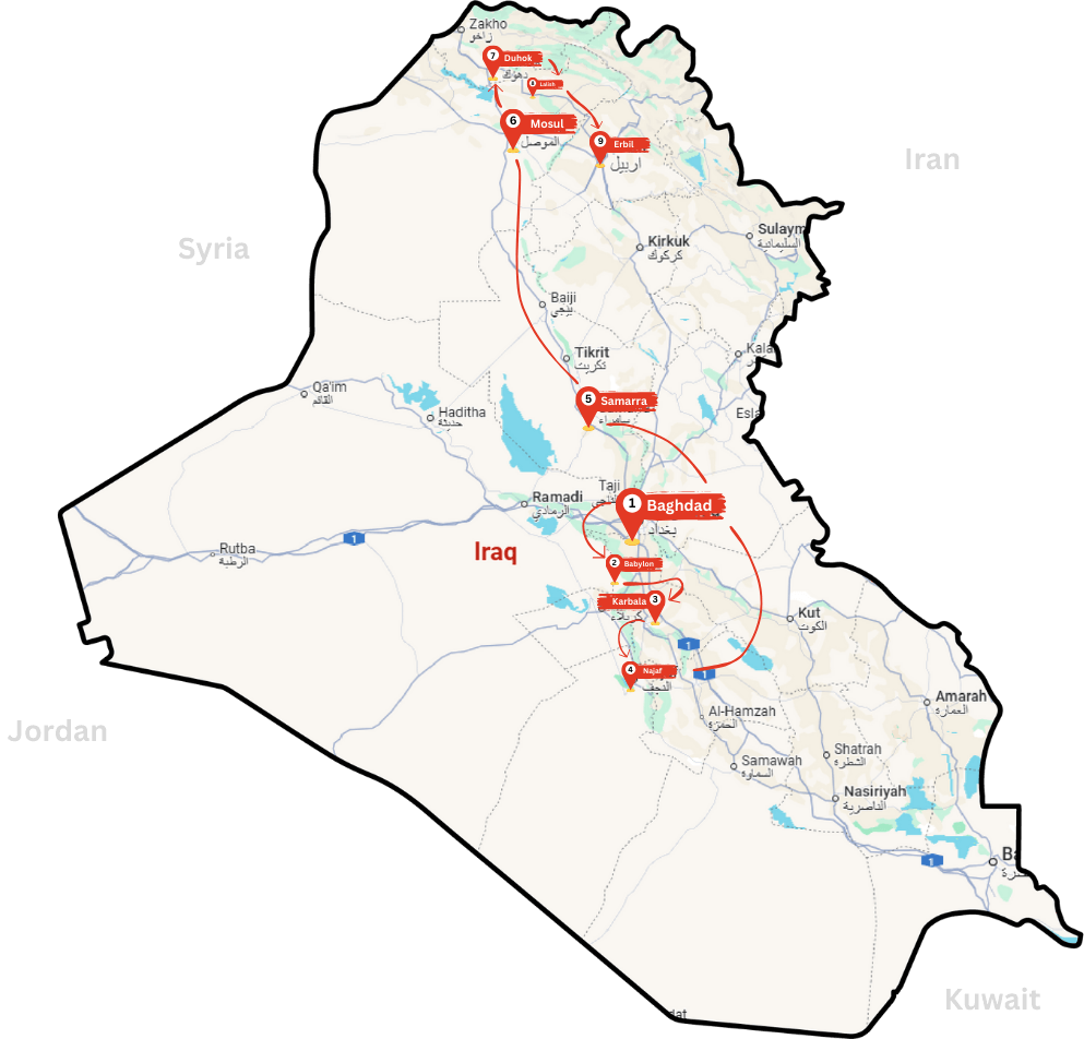 Embark on a journey to Iraq, the cradle of civilization, where the legacies of Mesopotamia—the land between the Tigris and Euphrates rivers—unfold. Discover UNESCO World Heritage Sites like the legendary ancient city of Babylon, home to the iconic Ishtar Gate and the Hanging Gardens. Explore Hatra's unique Hellenistic-Eastern architectural fusion and the ancient city of Ur, believed to be the birthplace of Abraham.